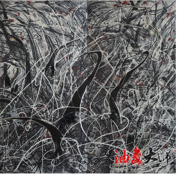 冯放作品中的意象积累,源自他多年来在电影美术、文化空间等领域的艺术探索。他的画面渗透出电影语言的某些影响——镜头转换与多层次的叠加,画面上从表层到底层的纵深维度的推展……当我们面对他的作品时,迎面而来的并非想象中艺术家对鹤的优雅姿态的表现,而是彻底混沌无序的画面:艺术家的画笔以很快的速度不假思索地掠过画面,以黑、白、灰三种色调构建出几乎铺满整个画面的、没有任何可辨结构的网络。