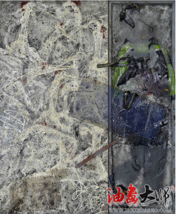 直到看到黑白灰的基调中不时出现的深红色,我们才能慢慢分辨出——更准确地说是联想出——被这混沌画面所裹挟的鹤的形象。因此,与其说艺术家意在再现鹤本身,不如说他关注的是画面上鹤所置身其中的纠缠和混沌的状态。看来,冯放更多地展现了形而上的精神探求,而这一切又必须诉诸绘画的材料和语言。他的画面仿佛是铁钉、板材、玻璃胶甚至羽毛等材料的实验场,材料之间的冲突与融合使得画面在看似纷乱的笔触中形成了强烈的张力。画面中的黑与白、凹与凸则是画家着意而为的东方哲学隐喻。