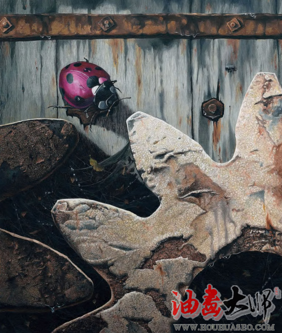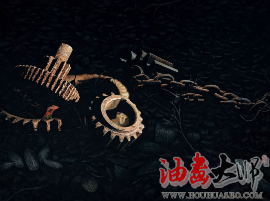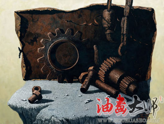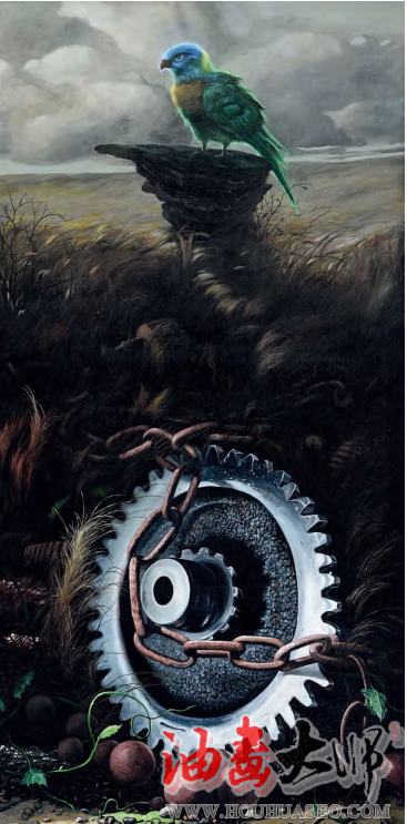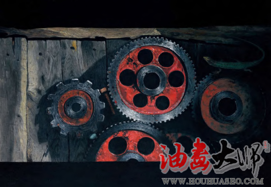 齿轮的坚硬、锈蚀、伤痕、斑驳、落漆有序的齿型排列,大小的合理连接,想象其运转时的力量美,在精美的描绘中让生命体附着于冰冷的金属体内,使它们有互动、有对话、有照应、有牵扯、有配重。用写实甚至超写实手法来表现,给予观者想要触摸的冲动,让视觉产生动力,触及脑皮中的传导系统,让人赏心悦目。