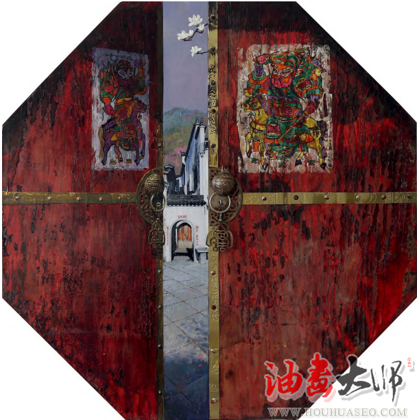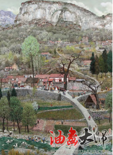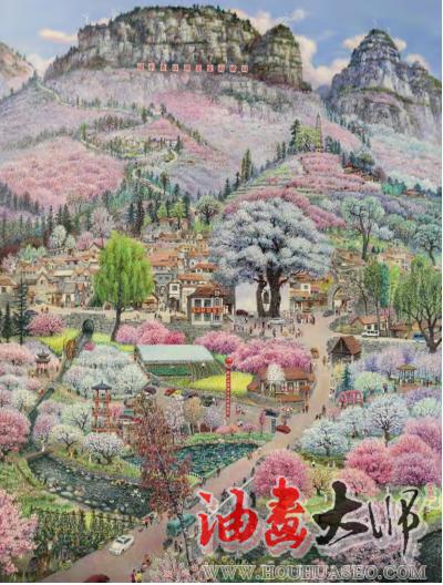 其艺术也可以理解为浪漫主义风格,马昭银先生的创作题材虽取自现实生活,但更偏重个性发挥,充满想象和丰富的情感表达,画面色彩绚丽而张扬、笔触多变而流畅,有着诗性的情怀,去触摸和表现重组出来的现实世界的理想瞬间。就其构图和画面布局分析,马昭银艺术较突出的特征便是借用中国画布局和传统年画构思,在“美丽山村”系列作品中尤为明显。