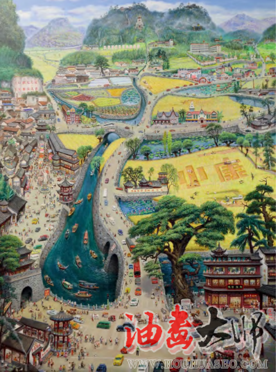 在马昭银的绘画中,特别是“美丽山村”系列作品里,每幅画大多是“满”状,多个形态各异的人物的集聚,或者是热热闹闹集市的描绘,给人以充实之感,一种喜庆快乐的气氛,显示出人们生活美满的场景。“多”的传递,从描绘人物多、内容多、景致多而言,人物形态各异、千姿百态,伴有瓦舍亭台,穿插着树木花卉,还有小桥流水的描摹,令人目不暇接,给人一种多子多福、福寿延年的思想暗示。