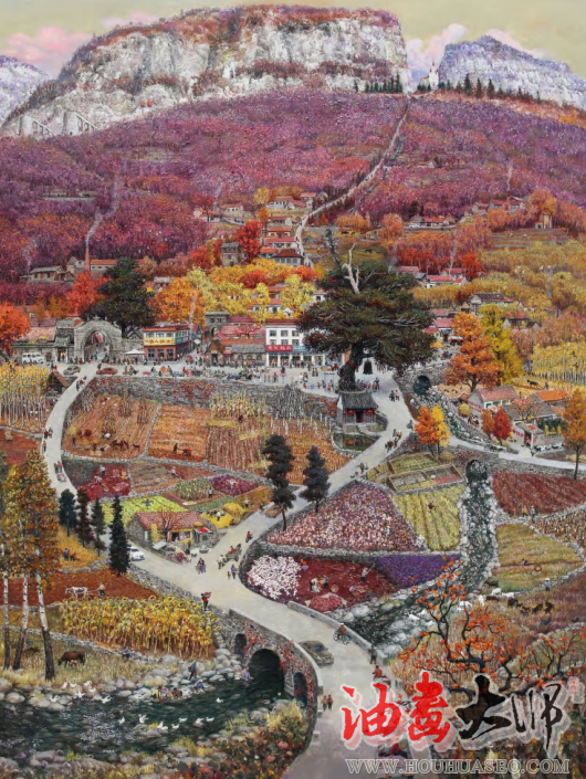 中国画布局上讲究均衡统一、跌宕起伏的画面。在山村系列作品中,进行远、中、近等景致处理上,画面景物藏露得宜、虚实相生,具有疏密有致的体验,去展现不同季节状态下的蒙山及齐鲁大地山村四季美景的时代气象。传统年画里的构图讲究“满”“多”,形成美美满满的意味。