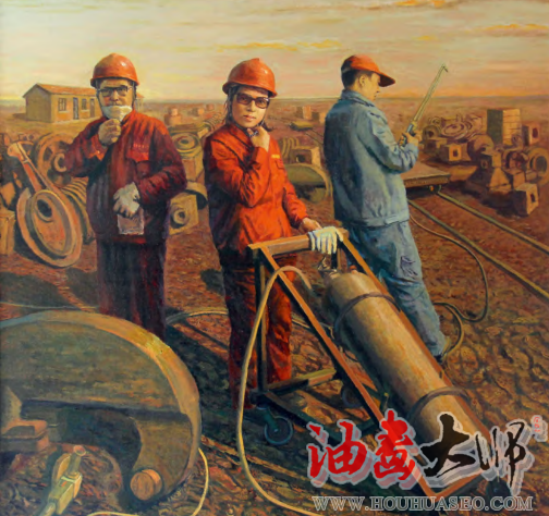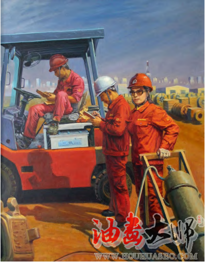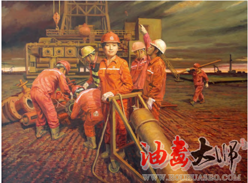 周营辉先生的油画的另一大特征,也是一大亮点,即在绘画题材的选择上高人一筹,直抒胸襟,他的绝大多数创作题材都是表现他熟悉的、工作的广阔油田,高耸的井架、隆隆的钻机声、闪烁的焊花、火红的锻造车间,夹杂着当中人物与情景,编织出一部生机勃勃的交响乐章,时时刻刻在画家心里激荡。
